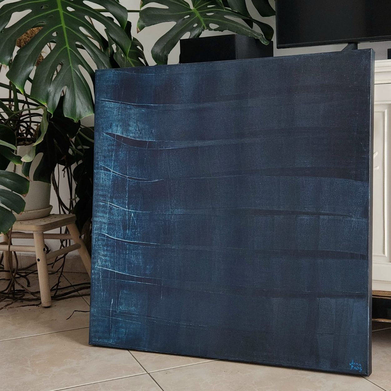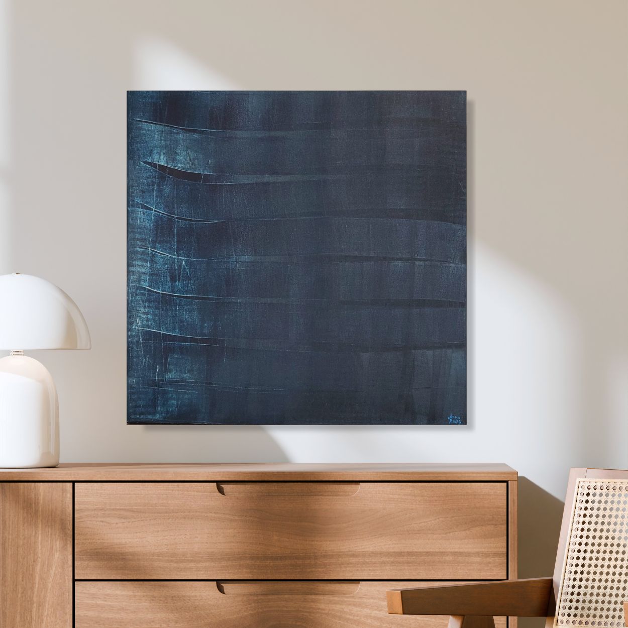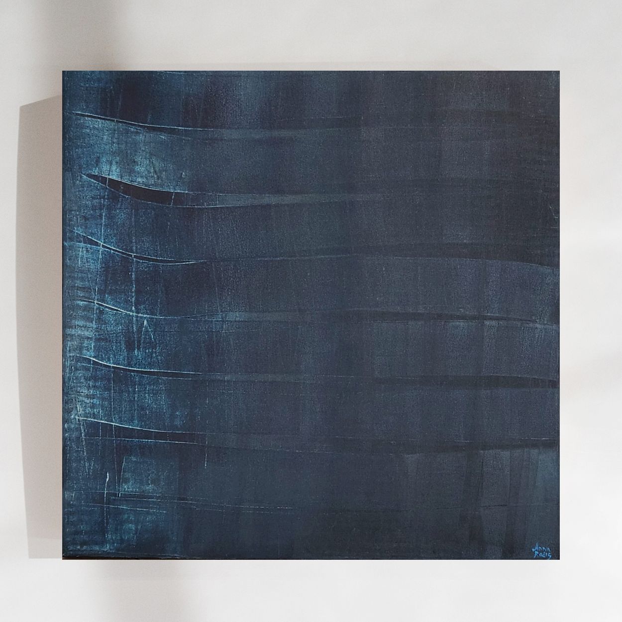 ציור אבסטרקט מינימליסטי בגווני כחול כהה, בגימור קטיפתי. זוהי עבודת יד, אקריליק על קנבס איטלקי מוכן לתלייה. שכבות רבות וחצי שקופות יוצרות עומק וממגנטות את הצופה פנימה. הציור מדמה ירידה הדרגתית אל עומקי התודעה, אל המקום בו מסתתרות המחשבות, הזיכרונות והרגשות.