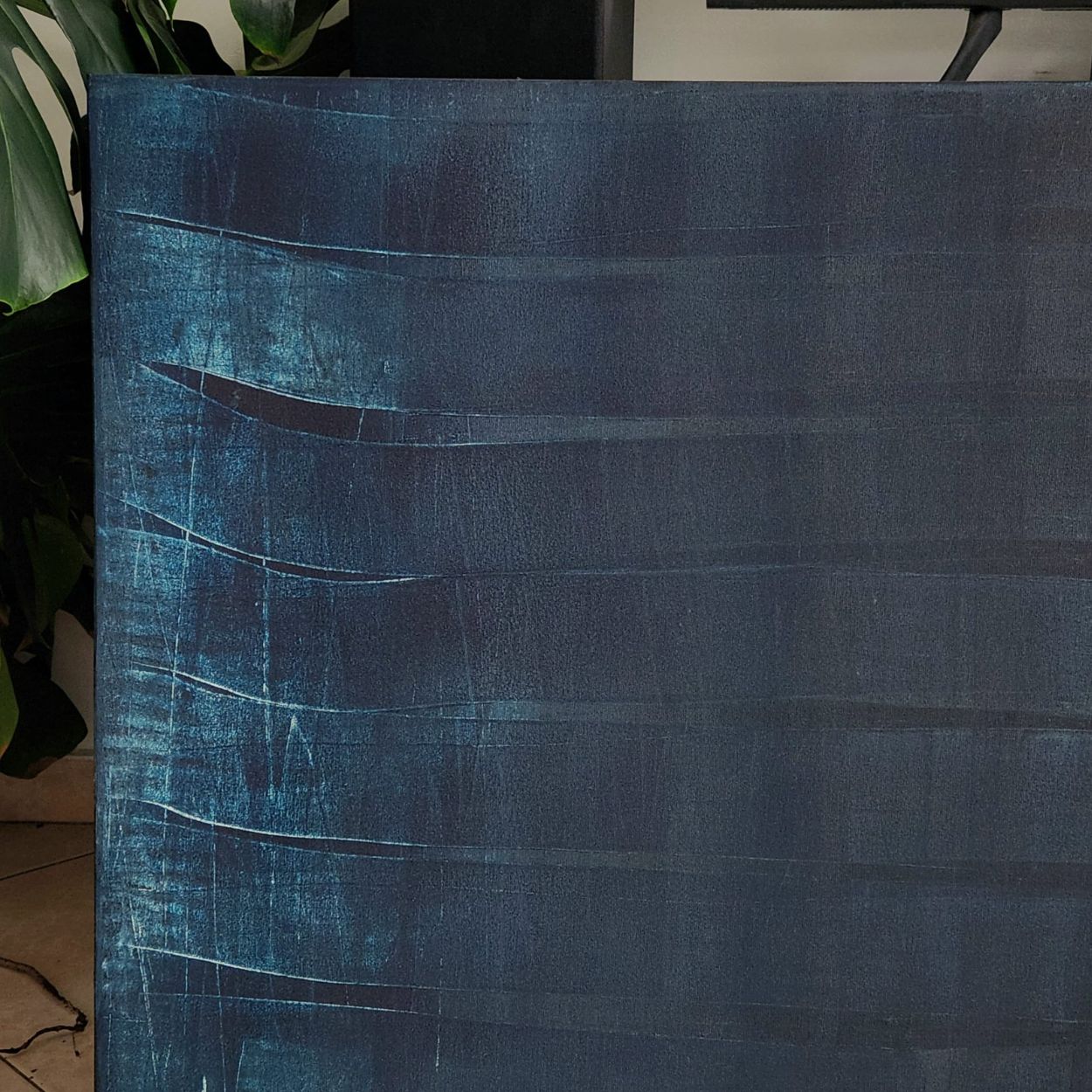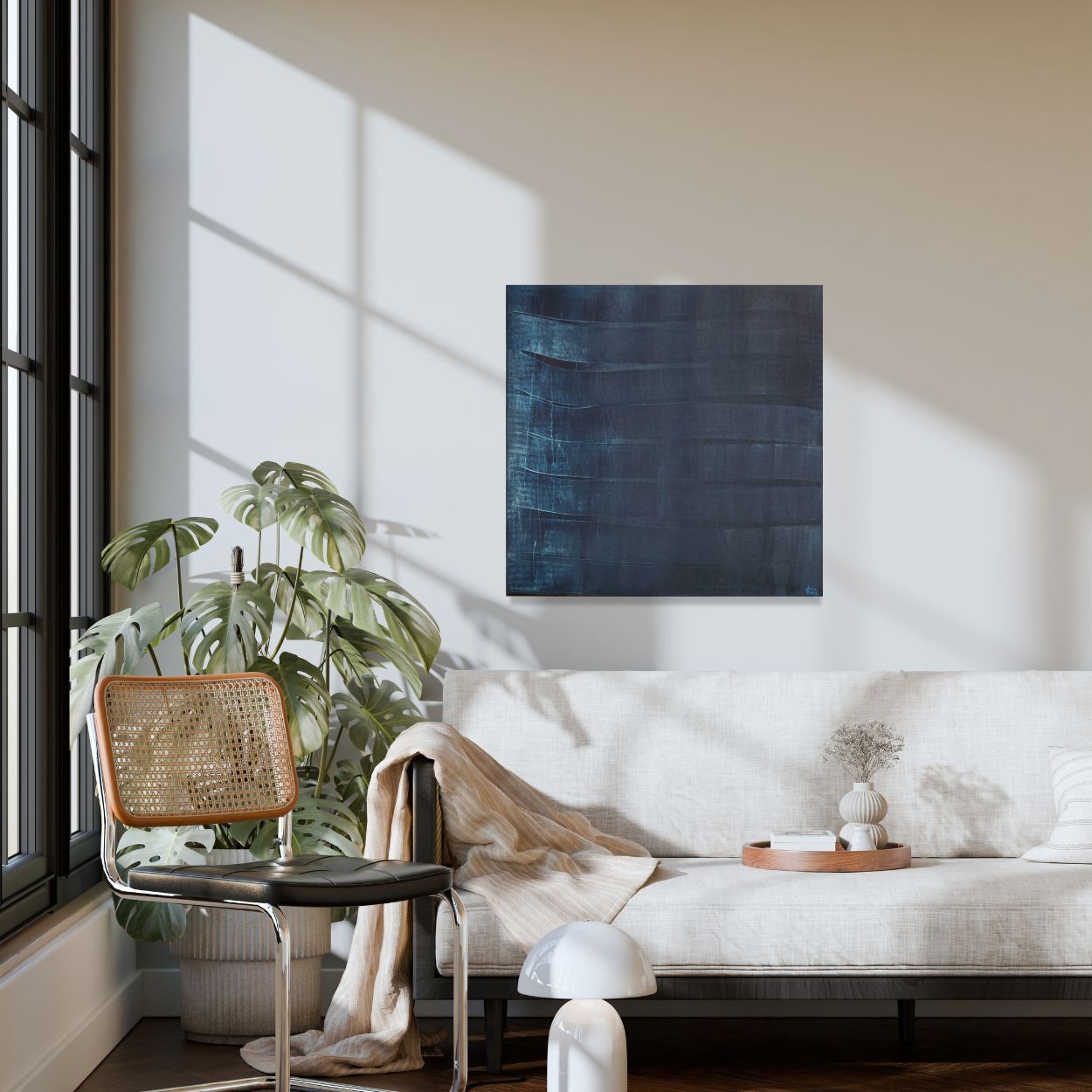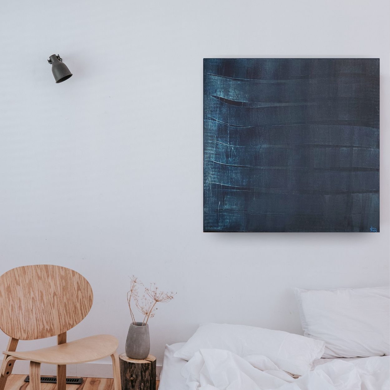 ציור אבסטרקט מינימליסטי בגווני כחול כהה, בגימור קטיפתי. זוהי עבודת יד, אקריליק על קנבס איטלקי מוכן לתלייה. שכבות רבות וחצי שקופות יוצרות עומק וממגנטות את הצופה פנימה. הציור מדמה ירידה הדרגתית אל עומקי התודעה, אל המקום בו מסתתרות המחשבות, הזיכרונות והרגשות.