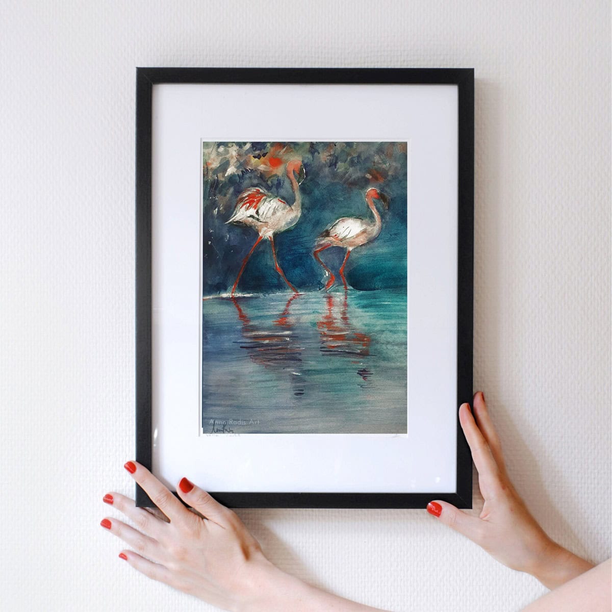 ציור מקורי בצבעי מים של זוג ציפורי פלמינגו, הולכים בתוך המים. אמנות ישראלית מקורית בגווני כחול עמוק, אדום בוהק ולבן. יצירה קונטרסטית שבוצעה בשכבות, תתאים למגוון חללים וסגנונות עיצוב. הציור אינו ממוסגר כך שתוכלי להתאים אותו לעיצוב שלך בעזרת המסגרת הנכונה, אפשר לקחת השראה מההדמיות שהכנתי.
