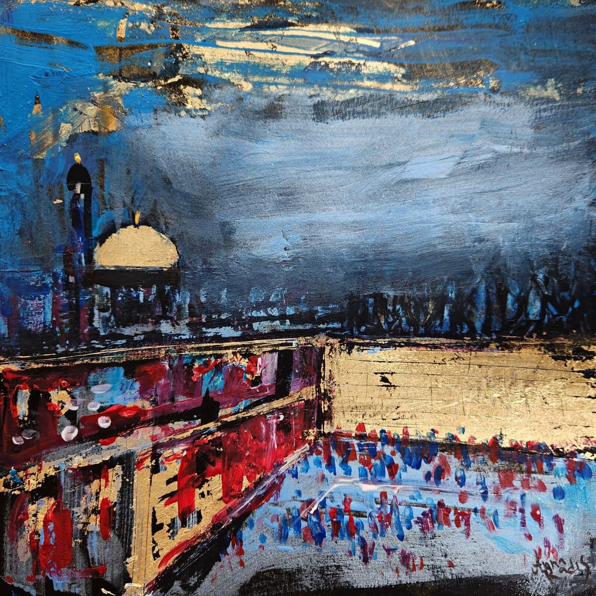 יודאיקה מודרנית, ציור קטן מקורי של הכותל בירושלים בסגנון אבסטרקט. ציור בוצע על נייר פבריאנו איטלקי שחור ועליו צבעי אקריליק ועלים דמוי זהב, ציור יתאים למגוון סגנונות עיצוביים ומגוון מסגרות.