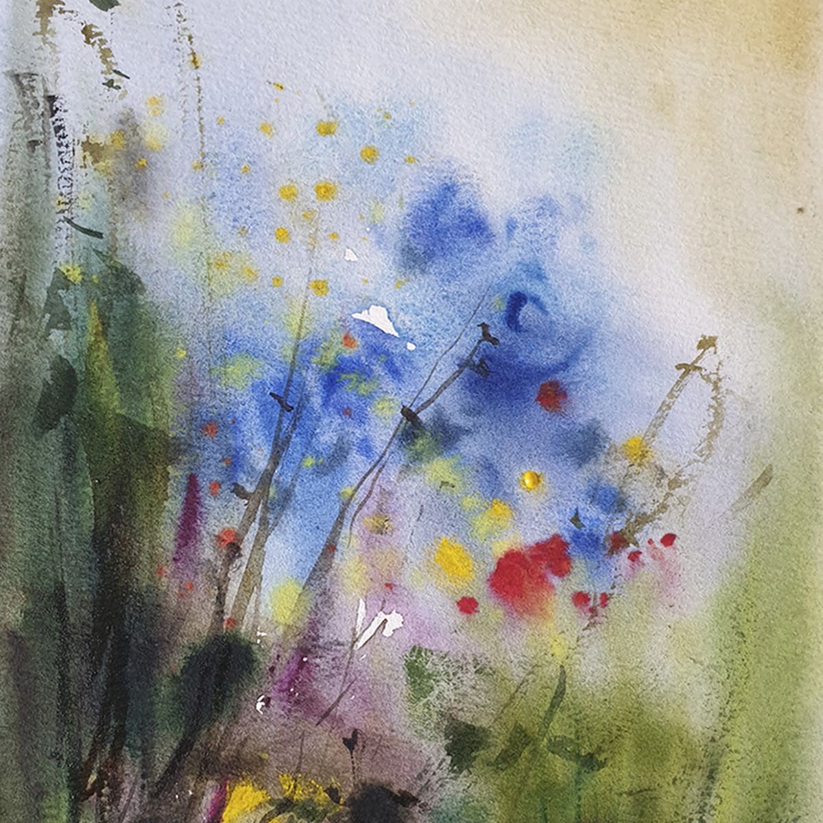 ציור מקורי קטן של שדה, גוונים השולטים הם ירוק וכחול. לאחר מסגור ניתן לתלות על הקיר או להניח על שולחן.