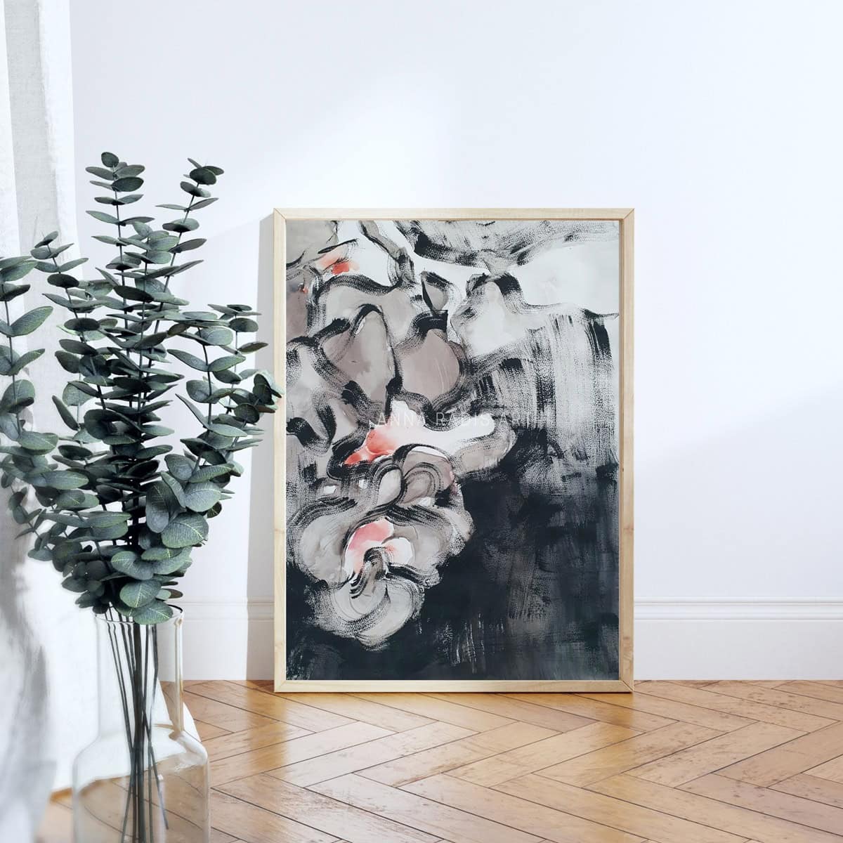 ציור אבסטרקט פרחוני ומקורי עם המון תנועה שמסמל צמיחה. שחור, אפור, לבן ונגיעות גוון קורל, מתאים למגוון חללים לבית ולמשרד. הציור נשלח אינו ממוסגר, זה שמאפשר לך לבחור את המסגרת שמתאימה לחלל שלך, מומלץ לקחת השראה מהדמיות באתר.